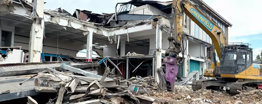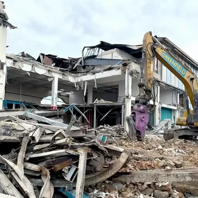 The building comprised office accommodation and warehouse space, extending to approximately 3,600m² with an overall height of 15 metres. To the rear of the site stood a 20-metre-high tin-clad chimney, which required careful sequencing and controlled dismantling.